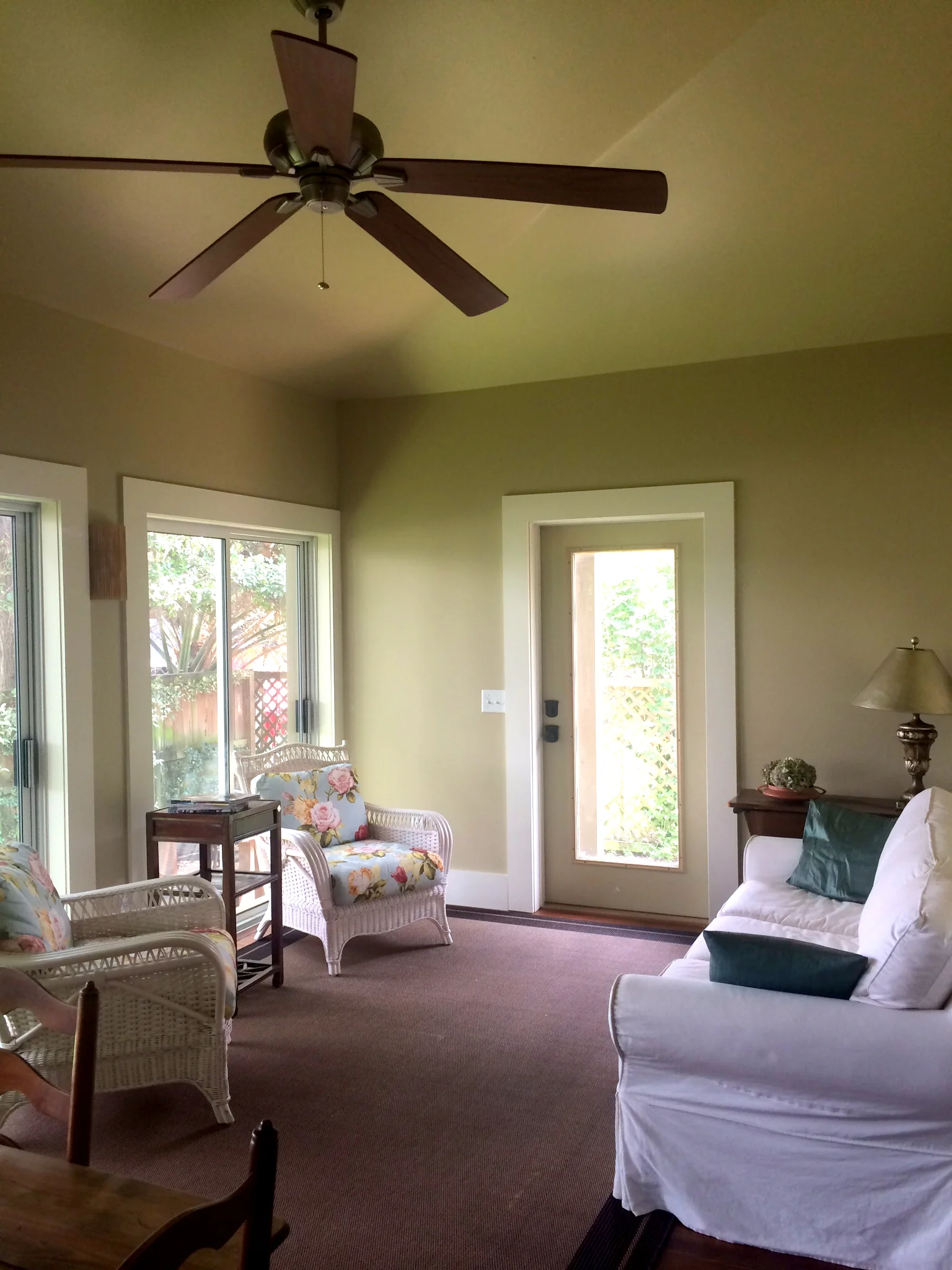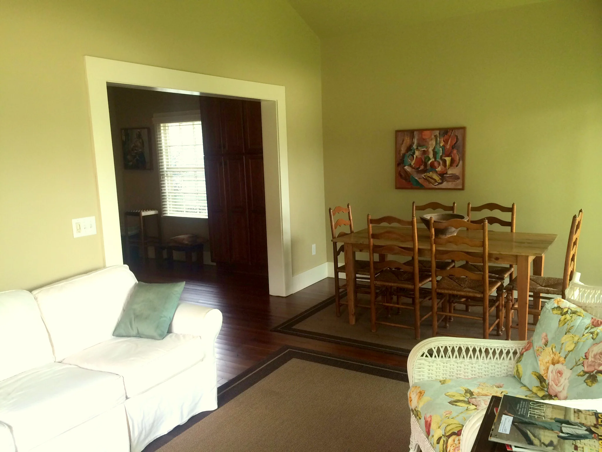 The sunroom has dining and living areas overlooking the courtyard and fountain. Many an evening can be filled with music coming from Seville Square.